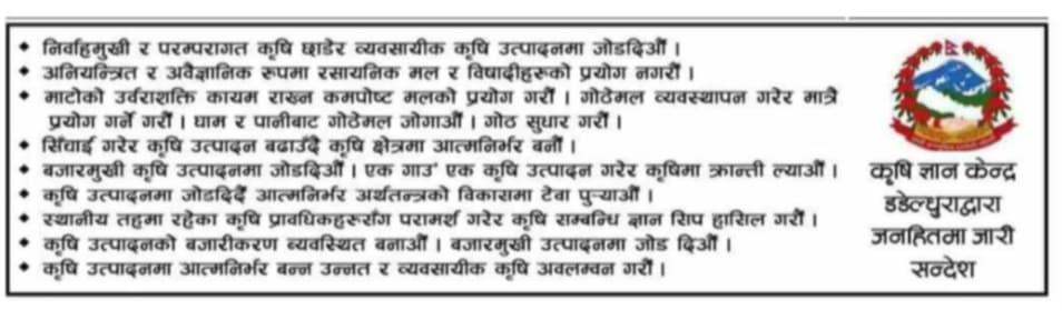 डडेल्धुरा : डडेल्धुरामा सुन्तला जातका फलफुल बगैंचा व्यवस्थापन तथा सुदृढीकरण गर्न कृषकलाई तालिम तथा सामाग्री हस्तान्तरण गरिएको छ। आइतबार कृषि ज्ञान केन्द्र डडेल्धुराको आयोजनामा जिल्लाको गन्यापधुरा गाउँपालिका वडा नम्बर ५ को रेल गाउँका कृषकहरुलाई तालिम सहित सामाग्री प्रयोग गर्ने तरिका र कृषि सामग्री हस्तान्तरण गरिएको हो।