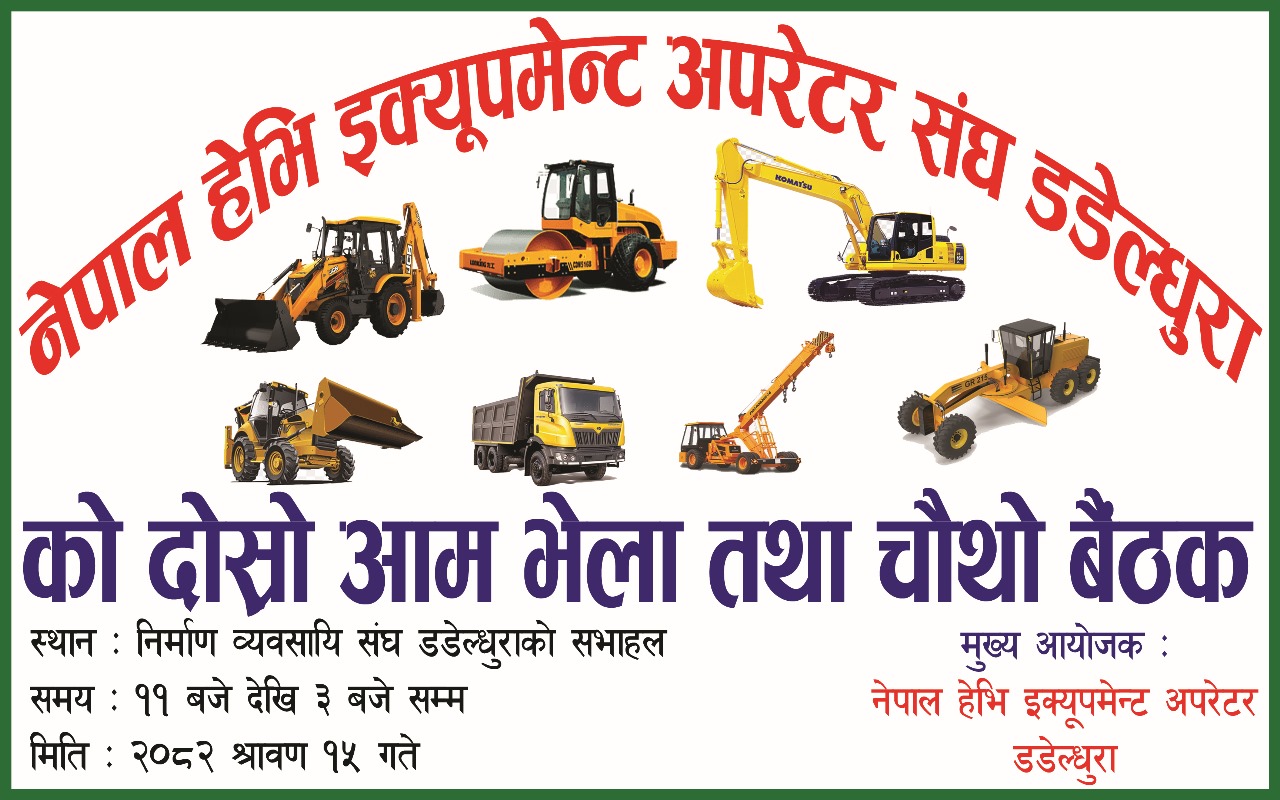 डडेल्धुरा । नेपाल हेभी इक्विपमेन्ट अपरेटर संघ, डडेल्धुराले आफ्नो दोस्रो भेला तथा चौथो बैठक सफलतापूर्वक सम्पन्न गरेको छ । भेलाको मुख्य उद्देश्य डोजर, एक्स्काभेटर, लोडर, र ग्रेडर जस्ता हेभी सवारी साधन चलाउने अपरेटरहरुले लामो समयदेखि भोग्दै आएका समस्याहरुलाई सम्बोधन गर्नु थियो ।