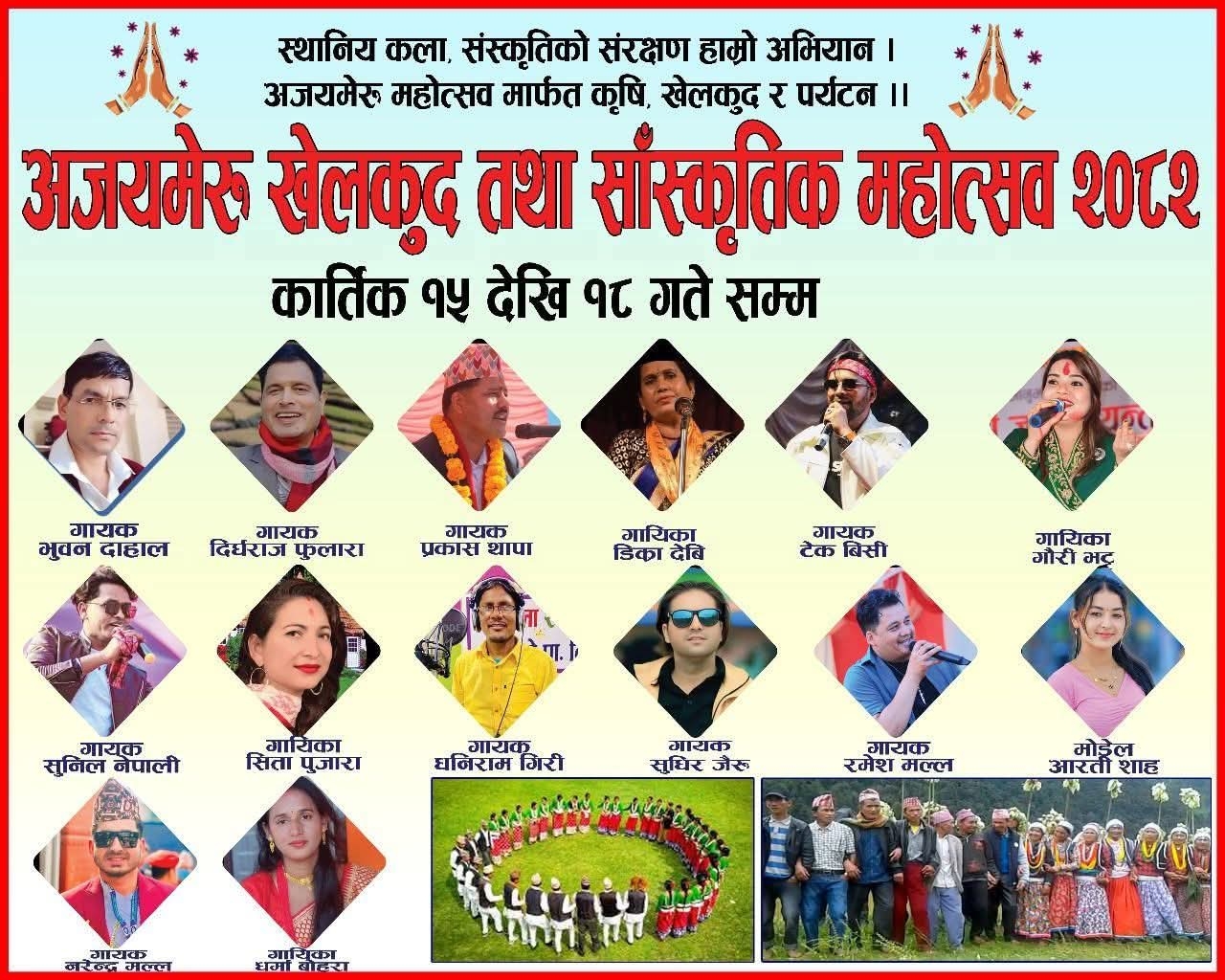 डडेल्धुरा । डडेल्धुरा जिल्लाको अजयमेरु गाउँपालिका, वडा नं. २ को आयोजनामा 'अजयमेरु महोत्सव २०८२' औपचारिक रूपमा सुरु भएको छ। गाउँपालिका अध्यक्ष उमेश भट्ट विकासले शनिबार एक विशेष समारोहका बिच महोत्सवको उदघाटन गर्नुभएको हो।