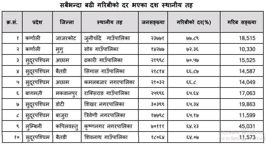 प्रतिवेदनका आधारमा देशभरका स्थानीय तहमध्ये सबैभन्दा बढी गरिबी दर भएका १० स्थानीय तह सार्वजनिक गरिएको छ। तीमध्ये अधिकांश कर्णाली र सुदूरपश्चिम प्रदेशका स्थानीय तहहरू सूचीको अग्रभागमा परेका छन्।