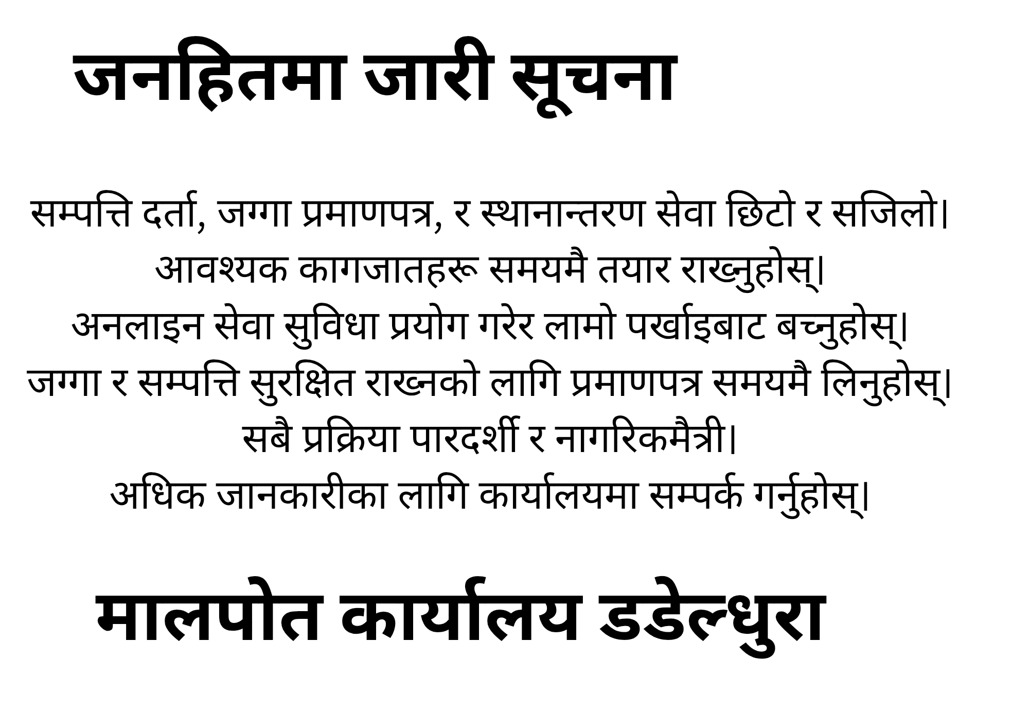 म २०८० भदौ ३० गतेदेखि मालपोत कार्यालय डडेलधुराको कार्यालय प्रमुखको जिम्मेवारीमा छु।
