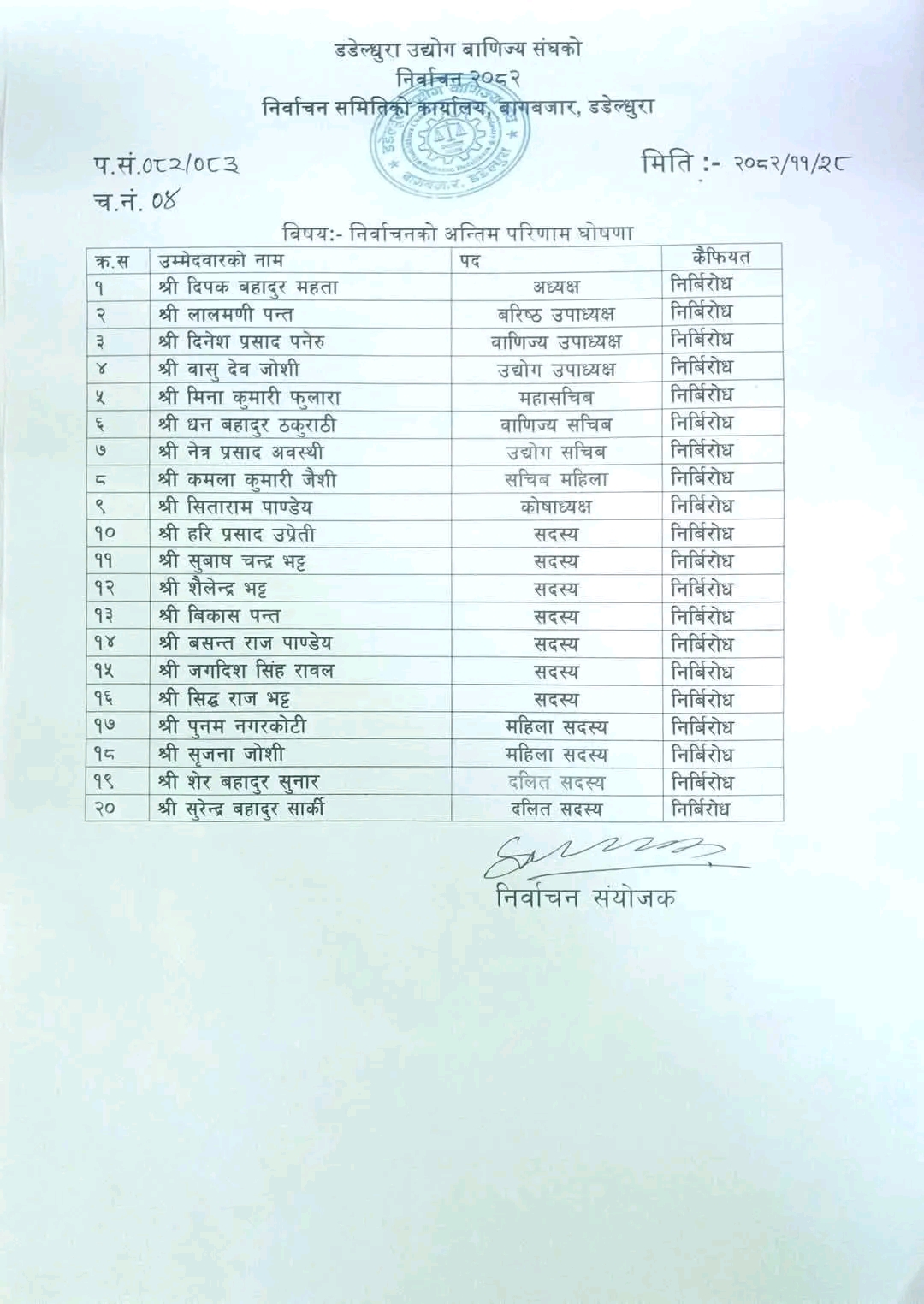 डडेल्धुरा - उद्योग वाणिज्य संघ, डडेल्धुराको नयाँ कार्यसमिति सहमतिका आधारमा निर्विरोध चयन भएको छ। निर्वाचन समितिले बिहीबार अन्तिम परिणाम सार्वजनिक गर्दै अध्यक्षसहित सबै पदमा उम्मेदवारहरू निर्विरोध भएको जनाएको हो। निर्वाचन समितिले सार्वजनिक गरेको अन्तिम परिणामअनुसार अध्यक्षसहित सबै पदाधिकारी तथा सदस्य निर्विरोध भएका हुन्।