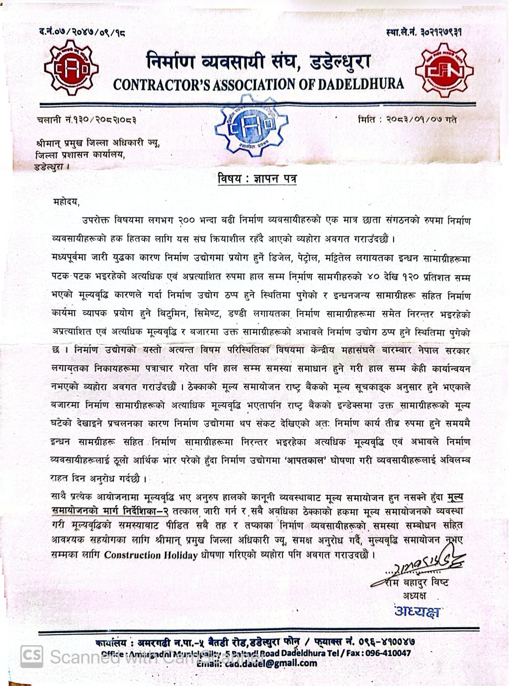 संघले सोमबार निमित्त प्रमुख जिल्ला अधिकारी अमर बहादुर ओलीमार्फत सरकारलाई ज्ञापनपत्र बुझाउँदै निर्माण क्षेत्रलाई ‘आपतकालीन अवस्था’ घोषणा गरी तत्काल राहत उपलब्ध गराउन माग गरेको छ। व्यवसायीहरूका अनुसार पछिल्लो समय निर्माण सामग्रीको मूल्य अस्वाभाविक रूपमा बढ्दा लागत व्यवस्थापन गर्न असम्भवजस्तै भएको छ।